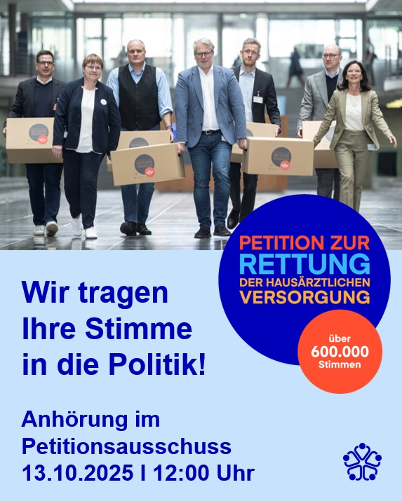 Am Montag, den 13.10.2025, ab 12:00 Uhr, wird sich der Petitionsausschuss mit den Forderungen der Hausärzteschaft, der Medizinischen Fachangestellten sowie unserer Patientinnen und Patienten auseinandersetzen.