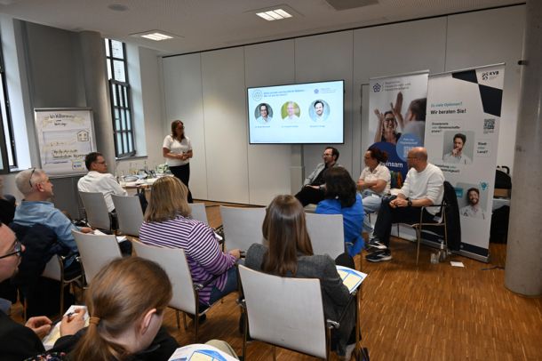 Über die Vielfalt in der Hausarztmedizin und die Vereinbarkeit von Beruf und Familie berichteten Dr. Annette Luther (Hausärztin, Regensburg) und Dr. Luca Frank (Hausarzt, Tirschenreuth), die ihren Traumberuf auf sehr unterschiedliche Weise ausüben: Während Dr. Annette Luther als Hausärztin mit einer Einzelpraxis in Regensburg Beruf und Familie sehr gut unter einen Hut bekommt und ihre Entscheidung für die Selbstständigkeit keinen Tag bereut hat, zieht Dr. Luca Frank ein anderes Modell vor. Für ihn sei die Einzelpraxis keine Option gewesen. Seit Januar 2025 ist der junge Vater selbstständiger Hausarzt in der Gemeinschaftspraxis im Krankenhaus Tirschenreuth. „Die Zukunftspraxis ist die Teampraxis“, ist er überzeugt.