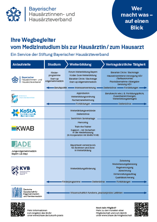 Auf dem Weg vom Medizinstudium bis zur Niederlassung als Hausärztin/Hausarzt werden euch immer wieder Fragestellungen begegnen, für die Ihr kompetente Ansprechpartner braucht. Die wichtigsten in Bayern wollen wir euch hier vorstellen.
